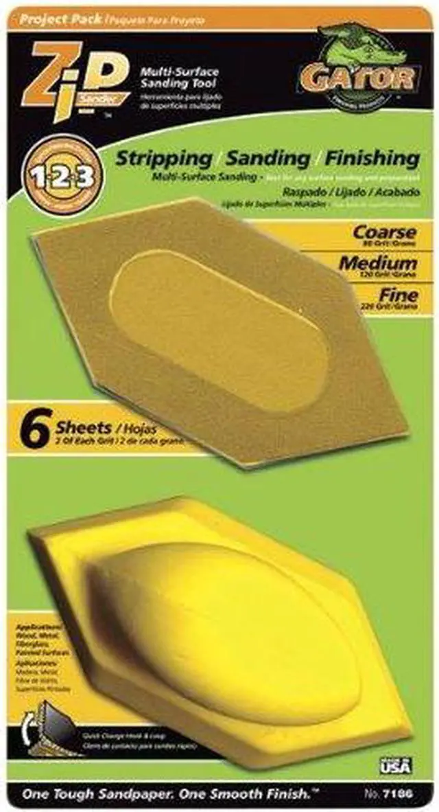 Great for sanding flat surfaces as well as hard-to-reach areas. The "Quick-Change" hook & loop holding system allows faster sheet changes. Comfortable foam handle fits snugly in your hand. Contains 2-220 grit 2-120 grit and 2-80 grit refill sheets and diamond shape sander.null