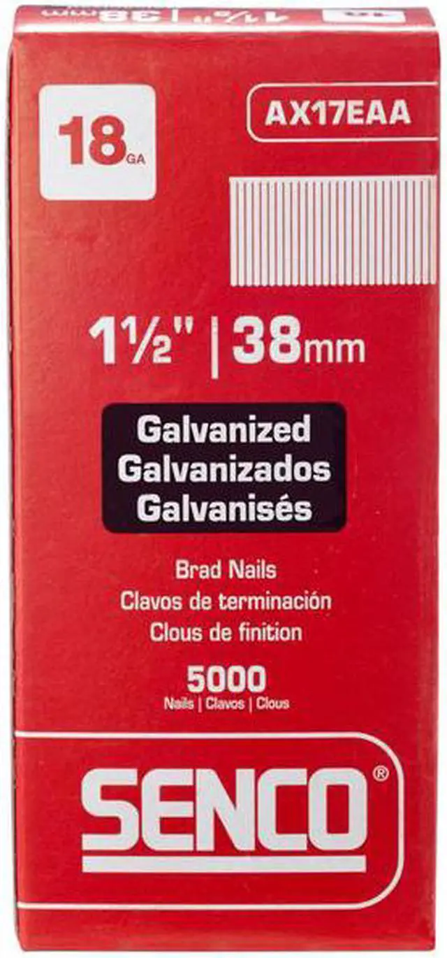 Straight Finish Nails, 1 1/2 In. L, PK5000, Overall Length 1 1/2 in, Shank Diameter 0.039 in, Gauge 18 ga, Product Type Finishing Nails, Material Steel, Finish Galvanized, Head Type Brad, Head Diameter 7/64 in, Shank Type Smooth, Point Type Conical, Collation Type Glue, Collation Configuration Strip, For Use With 18 ga Tools, Manufacturer Location Made in USA*, Package Quantity 5000. This item has been restricted from sale in the following state (s): []
