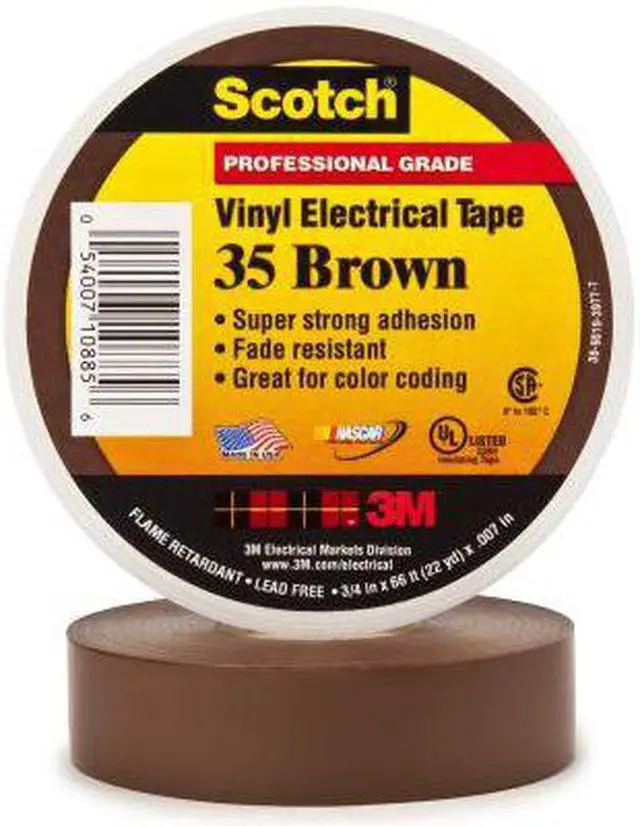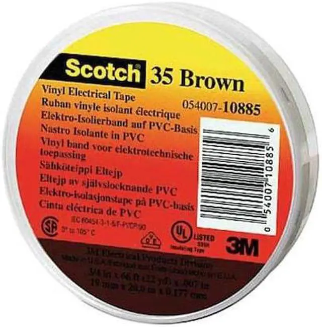 Electrical Tape, General Purpose, Polyvinyl Chloride Film, Tape Adhesive Material Rubber, 1/2 in, 6 5/8 yd, 7 mil, 3M (TM), Scotch (R), Series 35, Brown, Minimum Tape Performance Temperature 14 Degrees F, Maximum Tape Performance Temperature 221 Degrees F, Voltage Rating 600 V, Continuous Roll, Single-Sided, Package Quantity 100. This item has been restricted from sale in the following state (s): []
