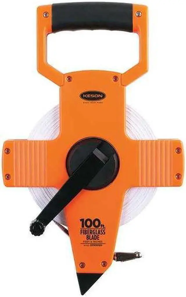 Engineers Tape Measures, Engineers Long Tape Measure, Engineers, Blade Length 100 ft, Blade Width 1/2 in, Graduation Type ft, Graduations 1/10, 1/100 ft, Blade Material Fiberglass, Tip Style Folding Hook, Zero Point, Case Type Open, Case Material ABS Plastic, Belt Clip No, Blade Color White, Case Color Orange, Blade Coating Clear, Lock Type No Lock, Rewind Type Manual, Standout Not Rated, Stud Markings Yes, Features Double Throat Rollers, Hook End