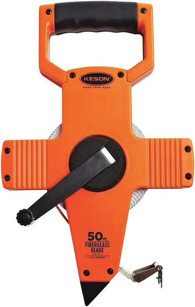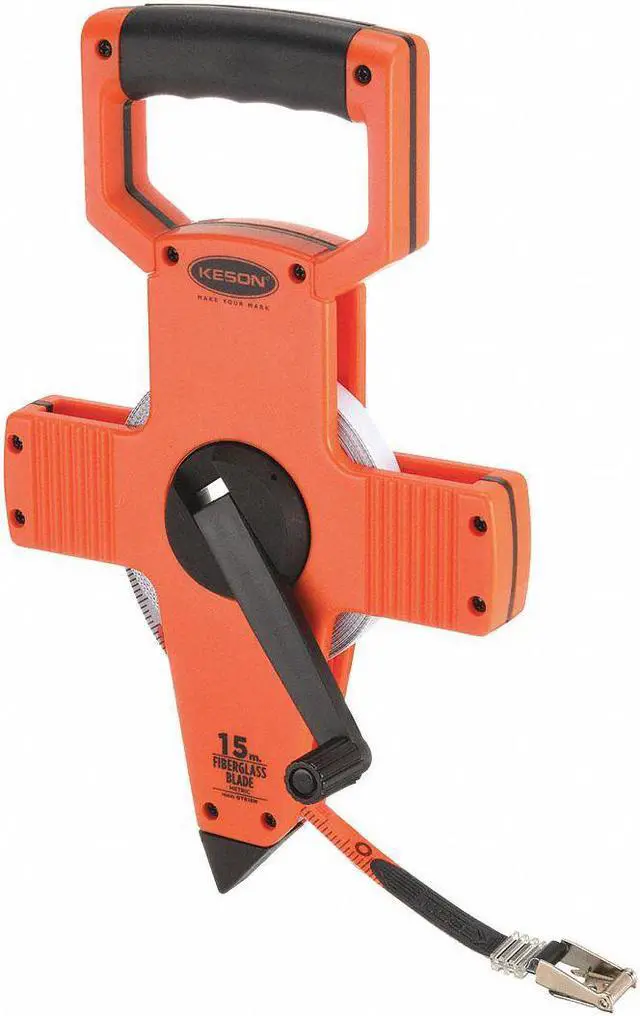 Long Tape Measure, Features Double Throat Rollers, Hook End, Case Material ABS Plastic, System of Measurement Metric, Graduation Marks 2 mm, Tip Style Nonmagnetic Single Hook, Zero Point Location Hook End, Blade Length - Metric 15 m, Blade Length - SAE Not Applicable, Blade Material Fiberglass, Blade Width 1/2 in, Blade Return Type Manual, Blade Type Single-Sided, Case Color High-Visibility Orange, Case Length 7 1/2 in, Lock Type Nonlocking, Graduation Units Centimeters, Meters. This item has been restricted from sale in the following state (s): []
