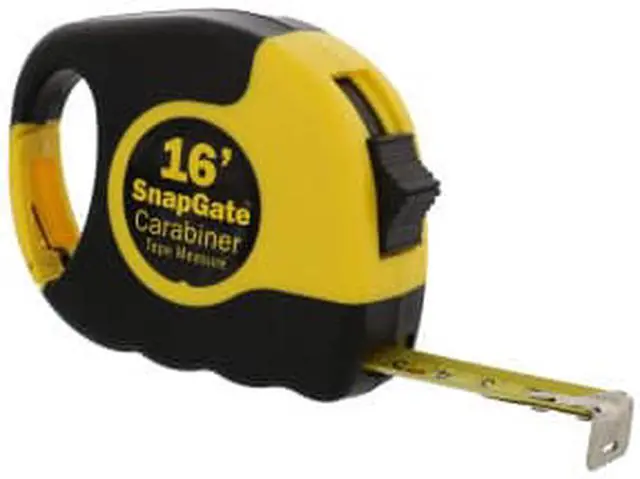 SnapGate, 00104, 16' Carabiner Tape Measure, Easy Grip Rubberized Coating, High Impact ABS Construction, Flip In Carabiner easily attaches to just about anything, Slide Button down to engage tape locking mechanism, Heavy Gauge Tape extends 16', You will never want to use another tape after just one use 00104.