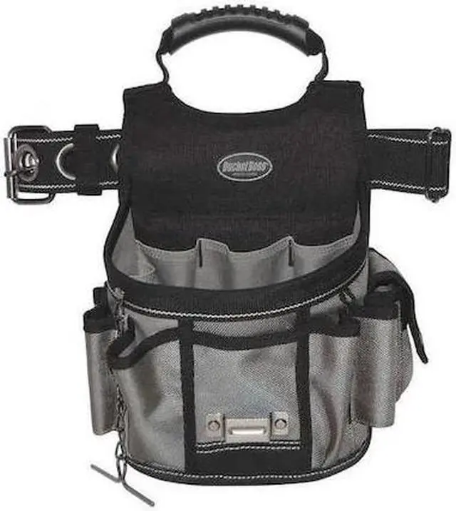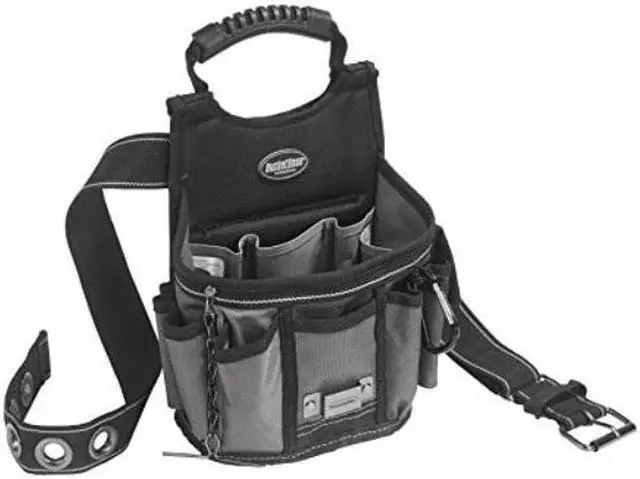 The Sparky Utility Pouch is designed to be carried 3 ways: attached on a belt, held by the handle, or over the shoulder. Structured sides allow pouch to sit at. Features 12 pockets and 4 sleeves for long-handled tools. Also included: belt that can be adjusted up to a 52 waist using thick steel grommets, T-chain electrical tape holder and a carabiner.