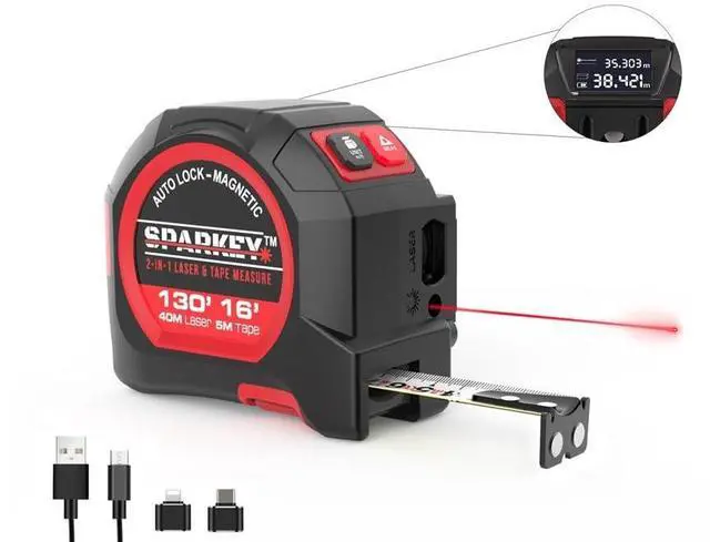 2-in-1 Laser Tape Measure, 130Ft Laser Distance Measurement, Area/Volume & 16Ft Tape Measuring, Magnetic Hook, USB Rechargeable, Auto Lock, M/Ft/in/Ft+in, LCD Display. Class II.