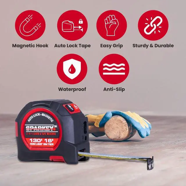 PRECISE & VERSATILE LASER TAPE MEASURE: Experience the ultimate convenience with the laser measuring tape, a 2-in-1 device featuring a 130ft laser distance measure and a 16ft laser tape measure. Enjoy precision with ±1/8 inch (laser) and ±1/16 inch (digital). With six laser modes, magnetic hook, USB recharge, and dual units, this measuring tape revolutionizes measuring tasks for any project.