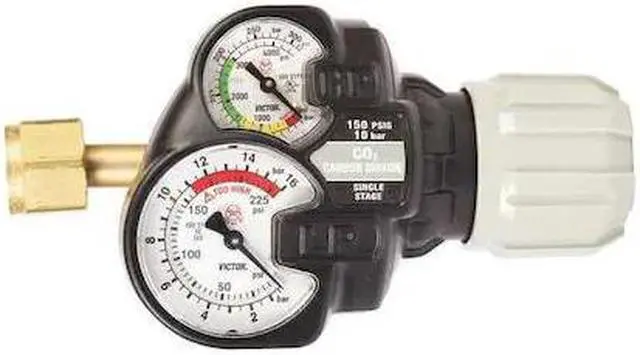 Gas Regulator, Regulator Supply Type Cylinder, Gas Service Carbon Dioxide, Stages Single Stage, Inlet Connection CGA-320, Outlet Connection 5/8 In. -18 RH, Delivery Pressure Range 5 to 150 psi, Gauge Size 2 1/2 in, Supply Pressure Gauge 4, 000 psi, Max. Inlet Pressure 3, 000 psi, Body Material Brass, Diaphragm Material Stainless Steel, Body Dia. 3.64 in, Standards Listed to UL252 by ETL, Regulator Application General