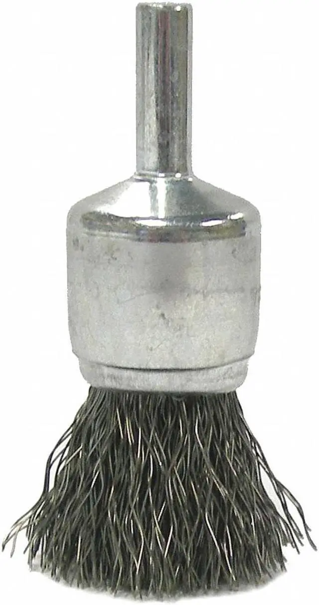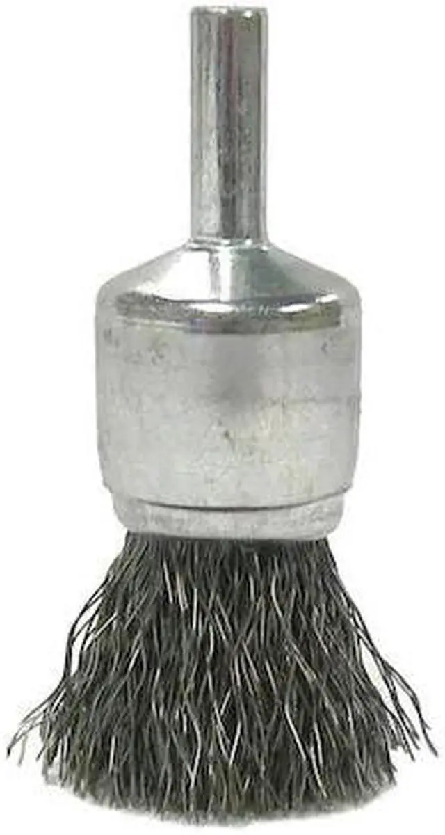 End Brush, End Brush, Bristle Type Crimped Wire, Brush Dia. 3/4 in, Abrasive Shank Size 1/4 in, Wire Dia. 0.014 in, Bristle Trim Length 7/8 in, Abrasive Material Stainless Steel, Max. RPM 22, 000 RPM