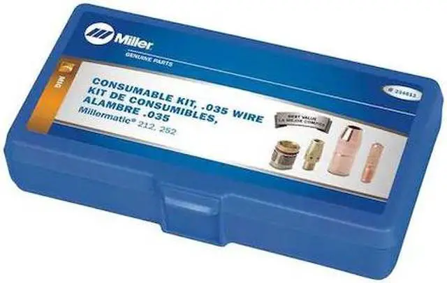 MIG Gun Consumables Kit, Compatible with Brand Miller, For MIG Gun Series M-25, For MIG Gun Model 169594, 169596, 169598, 169599, Maximum Wire Diameter 0.035 in, Includes (1) Contact Tip Adapter, (1) Nozzle, (1) Nozzle Adapter, (10) Contact Tips, Number of Pieces 13, Welding Processes Flux-Cored Welding (FCAW), MIG Welding (GMAW), Case Color Blue, Case Material Plastic. This item has been restricted from sale in the following state (s): []