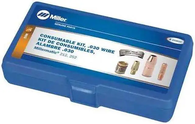 MIG Gun Consumables Kit, Compatible with Brand Miller, For MIG Gun Series M-25, For MIG Gun Model 169594, 169596, 169598, 169599, Maximum Wire Diameter 0.03 in, Includes (1) Contact Tip Adapter, (1) Nozzle, (1) Nozzle Adapter, (10) Contact Tips, Number of Pieces 13, Welding Processes Flux-Cored Welding (FCAW), MIG Welding (GMAW), Case Color Blue, Case Material Plastic. This item has been restricted from sale in the following state (s): []
