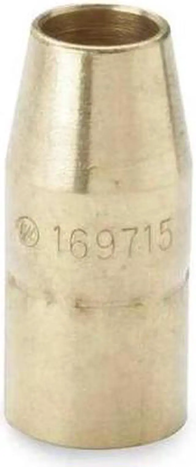 Nozzle, Compatible with Brand Hobart, Miller, Series M-Series, Compatible with Series HR100, M-10, M-15, Compatible with Model 169589, 169591, 169593, 195605, 284546, 285033, Bore Diameter 1/2 in, Connection Type Slip-On, Nozzle to Tip Relationship Flush, Nozzle Number 169715, Nozzle Shape Conical, Material Brass, Insulation Type Self-Insulated, Duty Rating Standard Duty, For Contact Tip Series M-Series, For Gas Diffuser Number 169716, Welding Processes MIG Welding (GMAW)