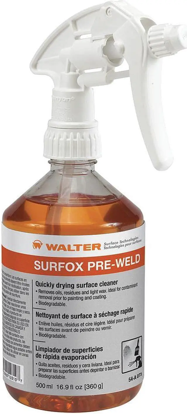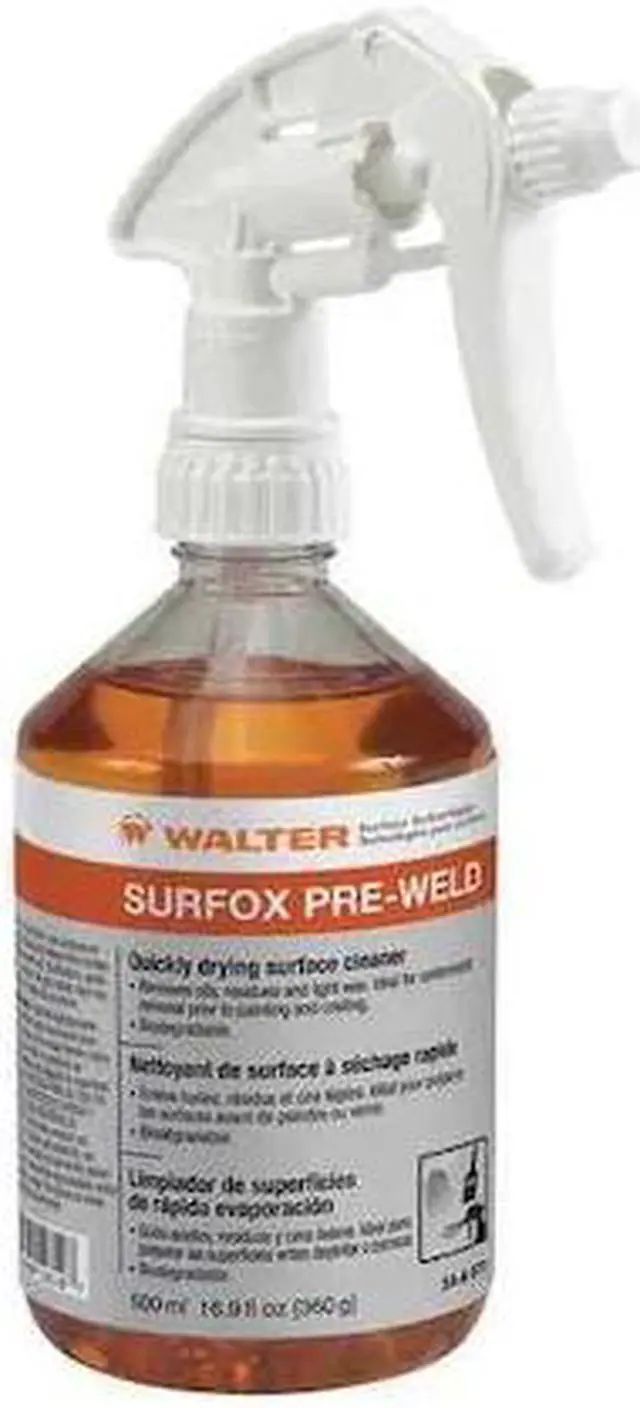 Light Surface Cleaner, Product Type Pre-Weld Surface Cleaner, Container Capacity 500 mL, Container Type Spray Bottle, Series Surfox Pre-Weld, Standards NSF Registered, Agent Color Orange, Chemical Base Isopropyl Alcohol, Cleaning Functions Preparing And Degreasing Metallic Surfaces Prior to Applying Conventional or Water-Based Coatings, Removes Contaminants such as Processing Oils, Anti-Corrosion Oils, Light Waxes, and Similar Contaminants, Compatible Material Type Aluminum, Stainless Steel. This item has been restricted from sale in the following state (s): []