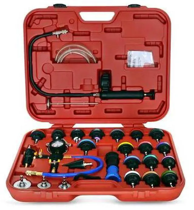 California Proposition 65: This product contains a chemical known to the State of California to cause birth defects or other reproductive harm. Easily perform cooling system and radiator pressure and leak tests with the STEELMAN 60025. Including 22 different test caps this kit is compatible with a wide range of foreign and domestic makes and models including Ford, GM, Mercury, BMW, Land Rover, Mini, Toyota, Kia, Dodge, Hyundai, Audi, Honda, Acura, Jeep, and many more. Pressurize and inspect for leaks in radiators and heater cores, head gaskets, headers, and water pumps with the included pressure pump that includes a built-in 0-35 PSI gauge and a 21-inch hose. Also included in the kit is a vacuum refill pump that lets you refill coolant systems while removing air from the system to prevent air lock. Color coded stripes on the nylon test adapter caps make identification and selection of the correct cap easy and the manual includes a detailed list of compatible makes and models for each adapter cap. To keep the kit organized it comes stored in a convenient blow-molded plastic case.