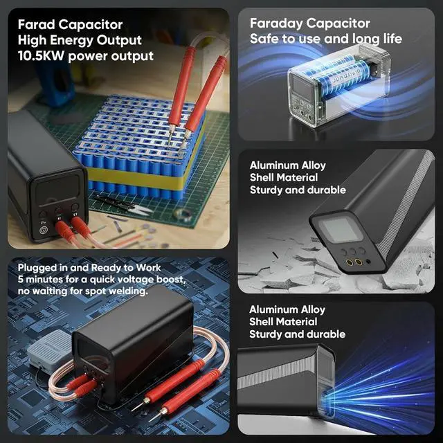 Farad Capacitor for Stable High Power Welding Built-in energy-storage capacitors deliver a controlled pulse output for consistent weld spots. Maximum pulse welding power up to 10.5 kW (up to 2000 A at 6 V) provides strong, stable welding performance for battery pack assembly. For best results, operate the welder while it remains connected to wall power.