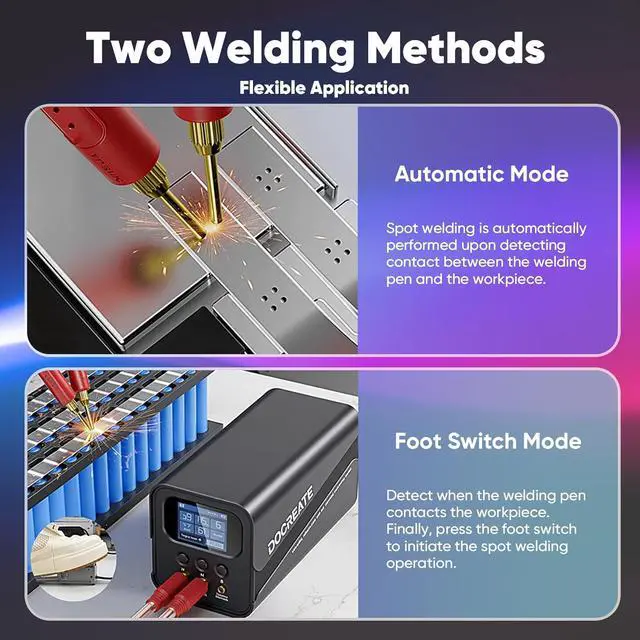 Automatic & Foot Pedal Welding Modes Offers two practical welding methods. In Automatic Mode, the welder triggers when the welding pen contacts the workpiece. In Foot Pedal Mode, you position the pen first and then step on the pedal to fire the weld, allowing steadier control on precise welds. Simple operation suitable for both beginners and experienced users.