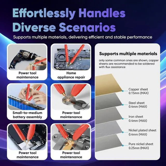 For Battery Packs & Multiple Metals Designed for assembling battery packs such as 18650, 14500, 21700, LiFePO4 and similar cells. Capable of spot welding thin sheets of copper (up to 0.15 mm), pure nickel (up to 0.25 mm), and steel / iron / nickel-plated sheet (up to 0.4 mm), when using appropriate power settings. Always wear protective gear such as safety goggles during operation.