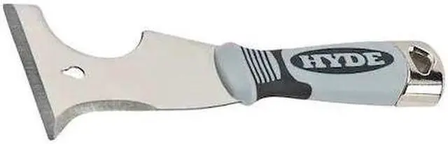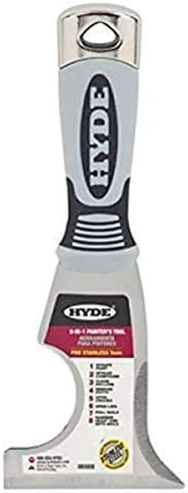 This Hyde 06988 Painters Tool is a must-have for any painter. The 8-in-1 blade can be used in a variety of ways, including scraping paint, puttying joints and scraping drywall mud. The 8-in-1 blade can be used to scrape paint, putty joints and scrape drywall mud. The die cast metal hammer head ensures that this tool will last forever. The handle is made of plastic with a soft grip design for added comfort. With the Hyde 06988 Painters Tool you will get through your next painting project with ease.. This item has been restricted from sale in the following state (s): []
