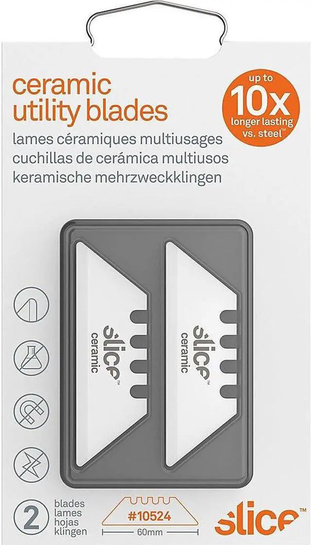 Safety Blade, Blade Edge Type Straight, Blade Length 2 5/16 in, Blade Material Ceramic, Blade Thickness 0.03125 in, Blade Tip Rounded, Blade Width 3/4 in, Compatible with Grainger Part Number 54ZW64, 55EK43, 55EK44, Compatible with Manufacturer Model Number 10490, 10491, 10590, 10594, Compatible with Series SLICE Scrapers, SLICE Utility Knives, Package Quantity 2