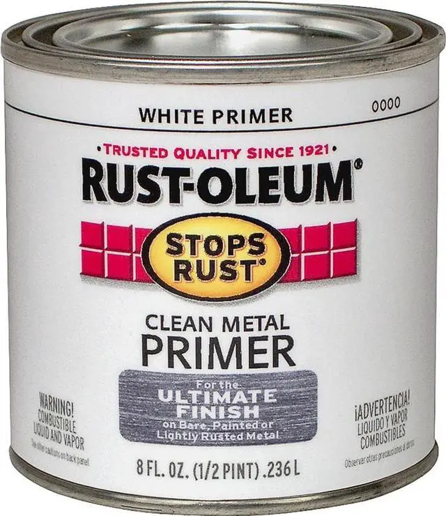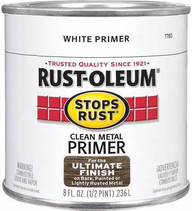 Designed for use on clean bare metal, previously coated or lightly rusted metal. This primer is compatible with Rust-Oleum Stops Rust brand finishes. This primer is not compatible with top coats that contain strong solvents such as automotive finishes. White clean metal primer covers approximately 550 Sq. Ft. per gallon at 1 mil. dry or 275 Sq. Ft. per gallon at 2 mils. dry. Dries to touch in 2 to 4 hours, to handle in 5 to 9 hours, and to recoat in 24 hours. Thin with no more than half pint paint thinner per gallon.