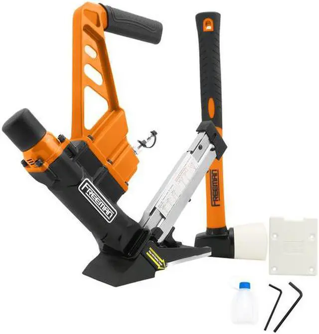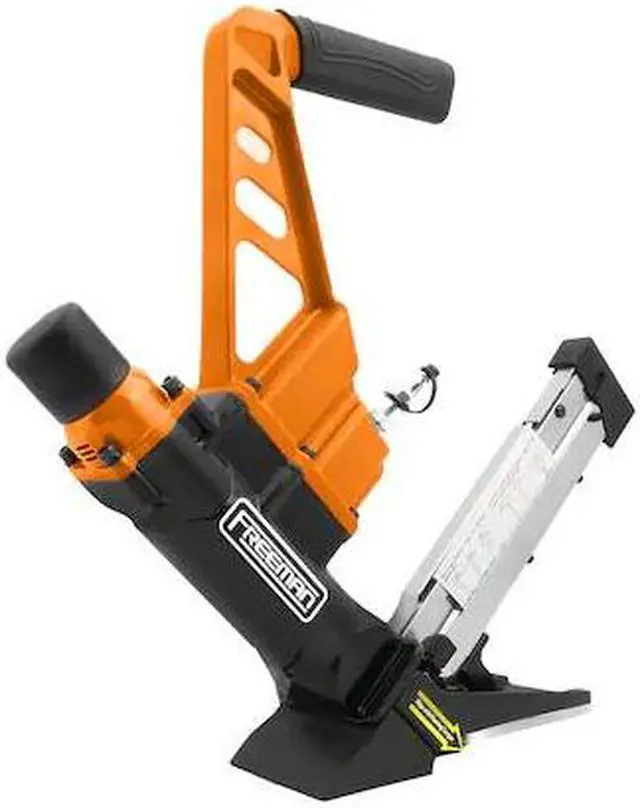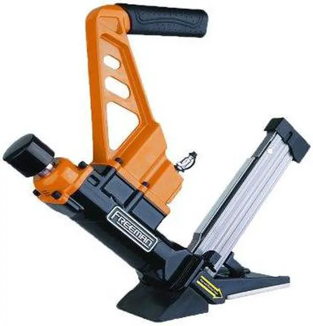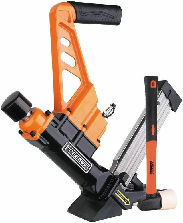 The Freeman PDX50C 3-in-1 15.5/16-Gauge 2 in. Flooring Nailer/Stapler is an excellent choice for your hardwood flooring needs. The PDX50C is perfect for anyone who wants professional quality at an affordable price, and it will pay for itself at the same price of a few rentals. Internally, the drive blade is constructed from a very tough heat-treated one-piece hardened steel, aluminum cylinder, high quality rubber O-rings and an internal air filter. It is lightweight and durable enough to be used all day every day. It can be equipped with 16-Gauge T-cleats and L-cleats as well as 15.5-Gauge flooring staples. The PDX50C comes with a convenient long reach fiberglass handle mallet with a padded grip, and can be used on all types of solid tongue and groove hardwood flooring.