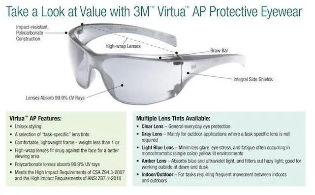 Safety Glasses, Series AP, Gender Unisex, Lens Color Clear, Polarized Lens No, Lens Coating Anti-Fog, No Foam Lined, Eyewear Frame Design Wraparound, Eyewear Frame Style Frameless, Frame Color Clear, Eyewear Size Universal, Frame Material Plastic, Lens Material Polycarbonate, Temple Color Clear, Temple Style Nonadjustable, Photochromatic Lens No, Metal Detectable No, X-Ray Detectable No, UV Protection 99.99 Percent UVA/UVB, Includes Not Applicable, Standards ANSI Z 87.1 -2015, CSA Z 94.3