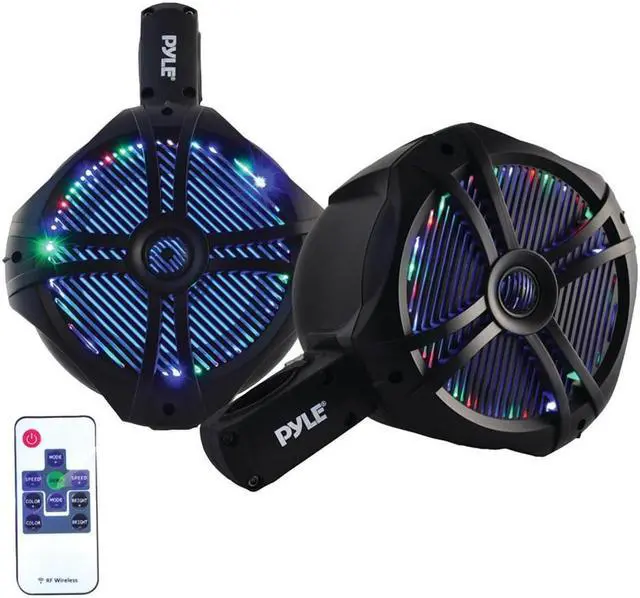 ? Color-changing RGB LED lights with built-in dancing/flashing patterns;? Speed & color adjustable;? Polypropylene woofer cones;? Butyl rubber surrounds;? Magnet structures;? 1" titanium dome tweeters;? 1" voice coils;? Imp: 4ohm ;? Heavy-duty ABS construction;? Chrome-plated speaker plug terminals;? Marine grade (IP44);? Includes remote, mounting bracket & hardware;? Pair;? Black;? 6.5";? 200W max;? 100W RMS;? Freq resp: 40Hz-20kHz;? Dim: 8.5"H x 8.5"W x 9"D; / ONE YEAR