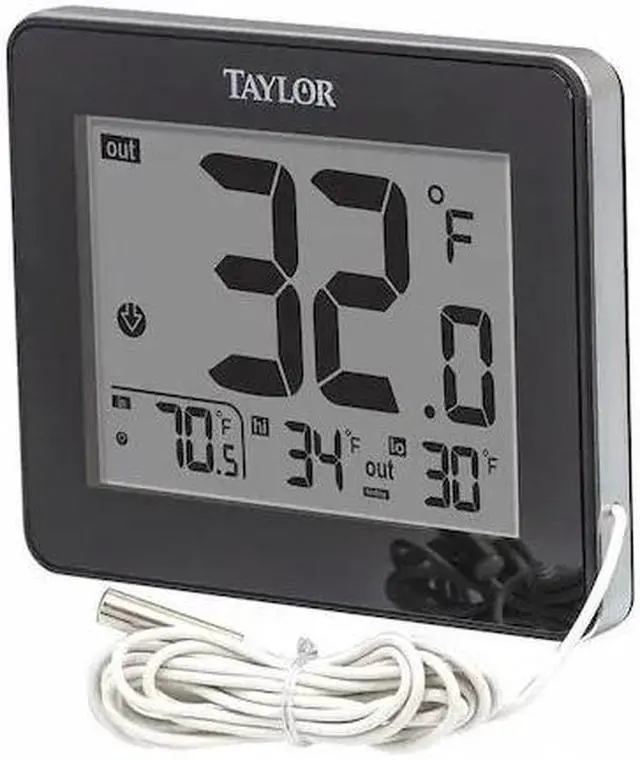 Taylor 1710 indoor/outdoor thermometer has a 10 Ft. wired probe that can register indoor temperatures from 32 to 122 degree F or 0 to 50 degree C, and outdoor temperatures from -40 to 158 degree F or -40 to 70 degree C. Features generously sized digits on an oversized LCD display making it easy to view the readout from any angle. Includes instruction manual and (1) CR2025 lithium battery. Stand or wall mount. 1 year warranty.