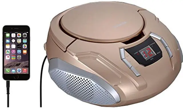 Tune into Sylvania\'s Portable CD Player with AM/FM Radio (Champagne). This AM/FM radio and CD player has 20-track memory, antenna and headphone jack. It even includes a built-in auxiliary input.. AM/FM radio. CD-R compatible CD player. Skip/search functions. 20-track programmable memory. Telescopic antenna. AC/DC. Aux input. Champagne