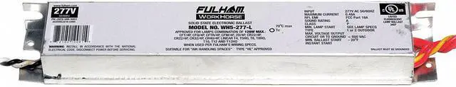 California Proposition 65: This product contains a chemical known to the State of California to cause birth defects or other reproductive harm. WorkHorse, Electronic, Fluorescent Ballast, Ballast Start Type Instant, Input Voltage 277V AC, Number of Bulbs Supported 1, 2, 3, 4, Max. Bulb Watts 12 W, 13 W, 15 W, 17 W, 24 W, 25 W, 28 W, 32 W, 44 W, 45 W, 55 W, 58 W, 60 W, 75 W, 80 W, 85 W, Ballast Bulb Type DBX, T12, T5-Circuline, T8, Dimming No, Dimming Type No Dimming, Dimming Method No Dimming, Dimming Range No Dimming, Min. Starting Temp. -22 Degrees F. This item has been restricted from sale in the following state (s): []