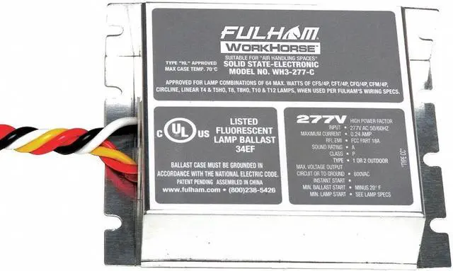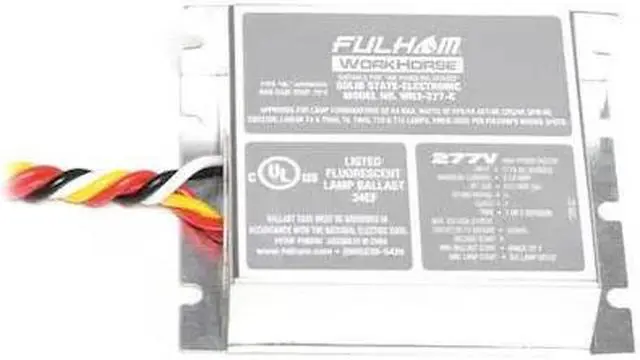 California Proposition 65: This product contains a chemical known to the State of California to cause birth defects or other reproductive harm. WorkHorse, Electronic, Fluorescent Ballast, Ballast Start Type Instant, Input Voltage 277V AC, Number of Bulbs Supported 1, 2, Max. Bulb Watts 12 W, 13 W, 14 W, 15 W, 17 W, 18 W, 19 W, 20 W, 25 W, 28 W, 30 W, 32 W, 34 W, 39 W, 40 W, 42 W, 44 W, 50 W, 54 W, 55 W, 60 W, 75 W, 80 W, 85 W, 100 W, Ballast Bulb Type BX, DBX, T10, T12, T12U, T5, T5-Circuline, T6, T8, Dimming No, Dimming Type No Dimming, Dimming Method No Dimming, Dimming Range No Dimming, Min. Starting Temp. -22 Degrees F. This item has been restricted from sale in the following state (s): []
