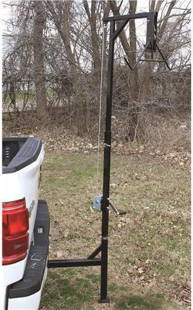 - 360 degree swiveling shaft with locking pin system- 400 lb capacity- Adjustable support foot for stability- Adjustable feet height 74 in. to 102in.- Gambrel included for skinning or cleaning game- Minimum Height: 74- Maximum Height: 102- Finish: black powder coating- Swivel Prevention Hook