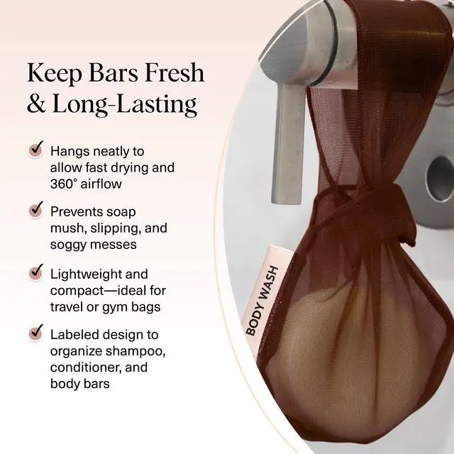 FUNCTIONAL & EASY TO USE SOAP POUCH The Kitsch soap bag is expertly designed with labeled pouches for body wash, shampoo, and conditioner bars, so youll never mix them up. This versatile bar soap bag and beauty bar bag hangs neatly in your shower for effortless organization and convenient daily use.