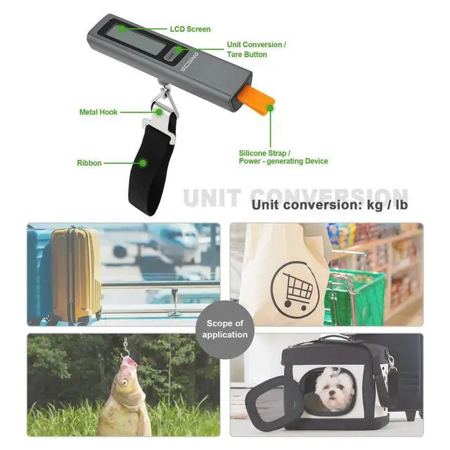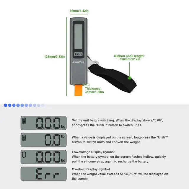 EASY TO USEJust quickly stretch the orange belt about 8 times,lighting up the clear LCD display in seconds for accurate readings without any startup delay.press the U/T button to convert the unit lb/kg.Accurate measurement, Unit conversion, Overload warning, Tare function so you never pay excess baggage fees again!