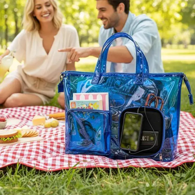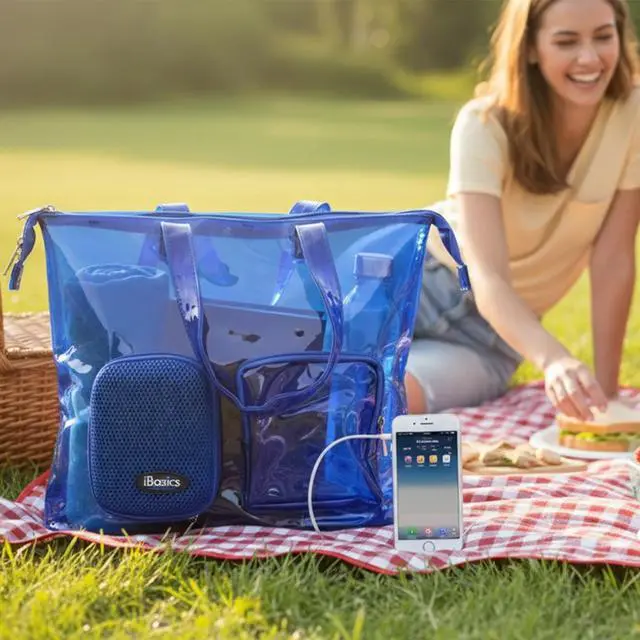 Enjoy music and stay organized wherever you go with the iBasics Waterproof Beach Tote Bag with Built-In Speaker. Designed for beach days, pool visits, gym sessions, and weekend travel, this large tote combines spacious storage with convenient audio playback.