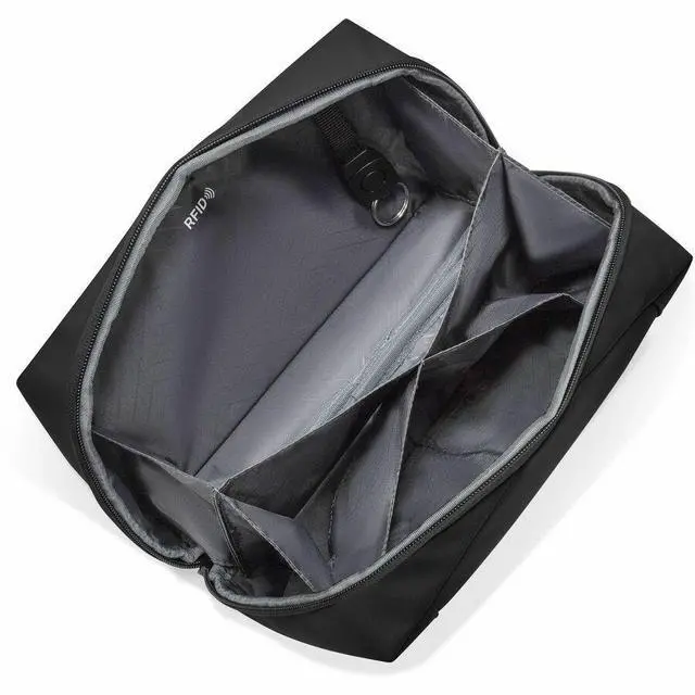 Introducing the Toiletry Bag from the Onyx Collection. Designed for the organized traveler, and perfect for neatly carrying your toiletries, personal care items, and travel must-haves. Its wide opening allows for full visibility and easy access. Crafted with premium Water-resistant PU material, this bag ensures durability and a sleek, modern look and is versatile enough to double as both a toiletry bag or a carrying case for your tech accessories. It features an RFID lining to protect your sensitive information from digital theft, back zip pocket for additional storage, and a carry handle for easy handling.