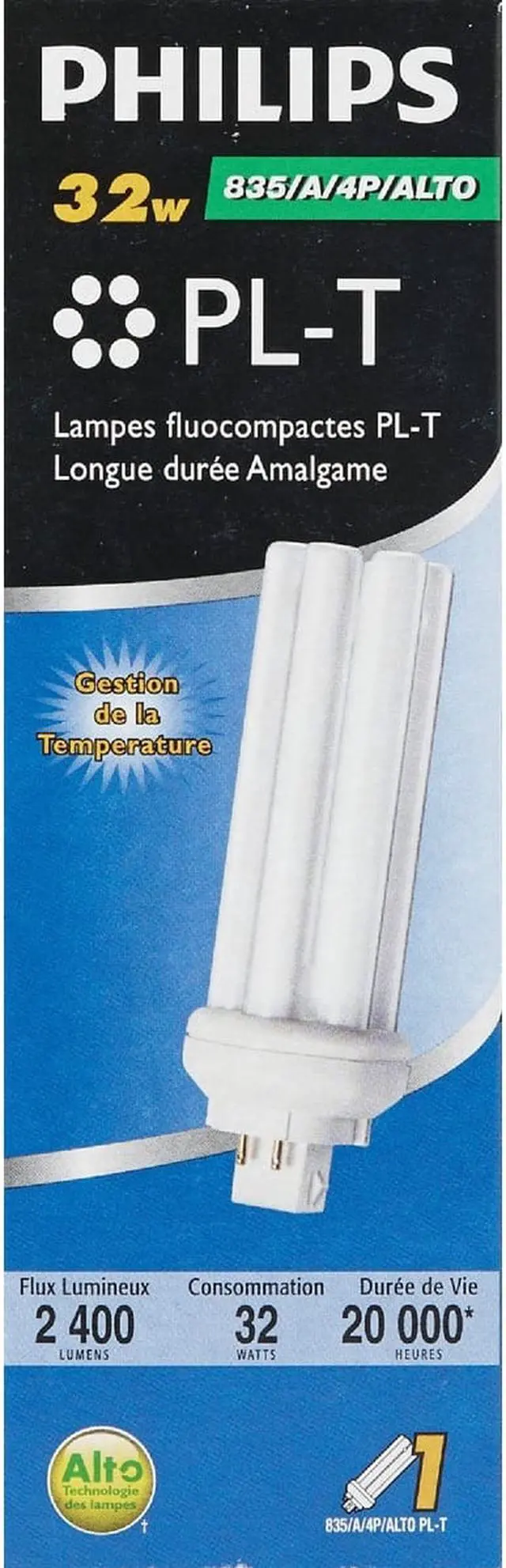 Plug-In CFL Bulb, Bulb Base Type 4-Pin (GX24q-3), Bulb Finish Frosted, Trade Number F32TBX/835/A/ECO, Bulb Shape T4, Color Rendering Index 82, Color Temperature 3500K, Incandescent Wattage Equivalency 150 W, Lumens 2, 400 lm, Bulb Housing Glass/Metal, Light Technology Fluorescent, Shatter-Resistant No, Voltage Ballast Dependent, Watts 32 W, Bulb Beam Angle Not Applicable, Three-Way No, Rough Service No, Dimmable Yes, Bulb Power Source Plug and Play, Light Color White. This item has been restricted from sale in the following state (s): []