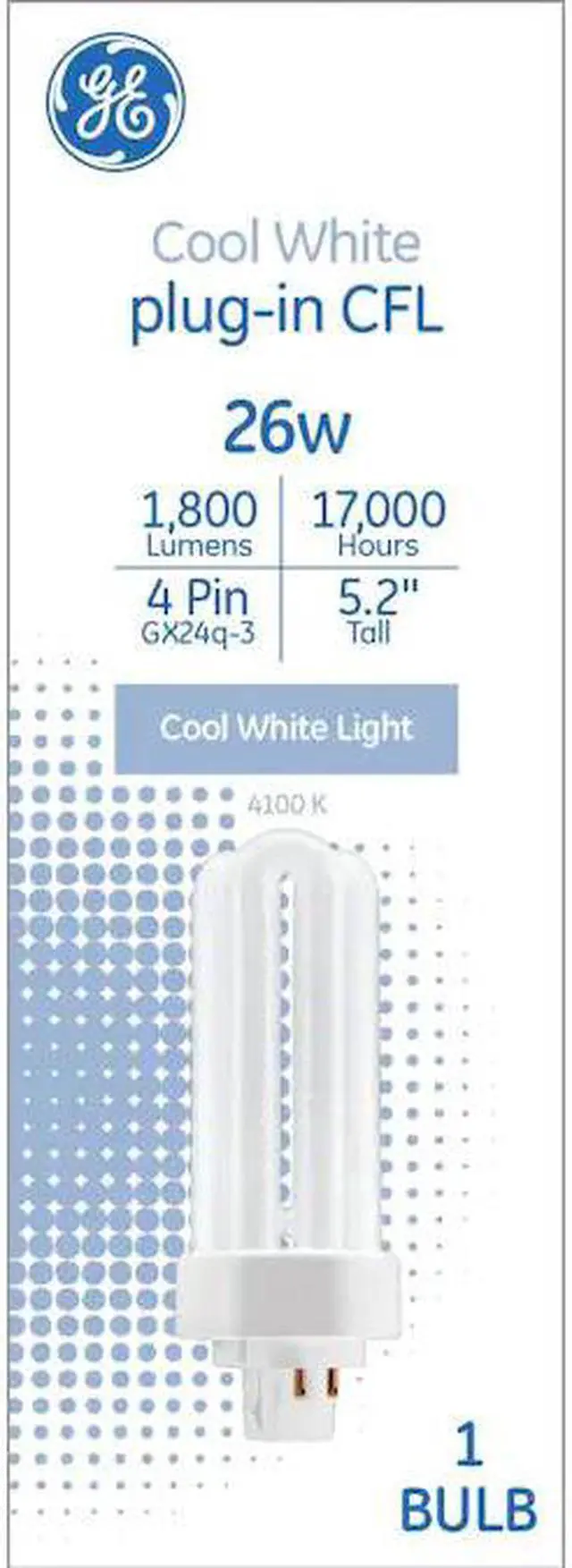 GE's KEY_TAB Cool White Plug-In CFL light bulbs are a versatile option for KEY_TAB low-energy, high-quality lighting applications. GE's cool white light KEY_TAB bulbs illuminate spaces with cool white light. Thanks to amalgam KEY_TAB technology, GE's plug-in CFL light bulbs provide great lumen maintenance KEY_TAB over a wide ambient temperature and stable lumen output in all burn KEY_TAB positions including enclosed fixtures and outdoor applications. And they KEY_TAB feature short warm up times and are TCLP compliant. Use this 26-Watt KEY_TAB Cool White Plug-In CFL light bulb in residential and commercial fixtures KEY_TAB with 2-pin GX24q-3 sockets.