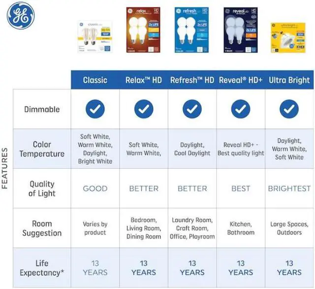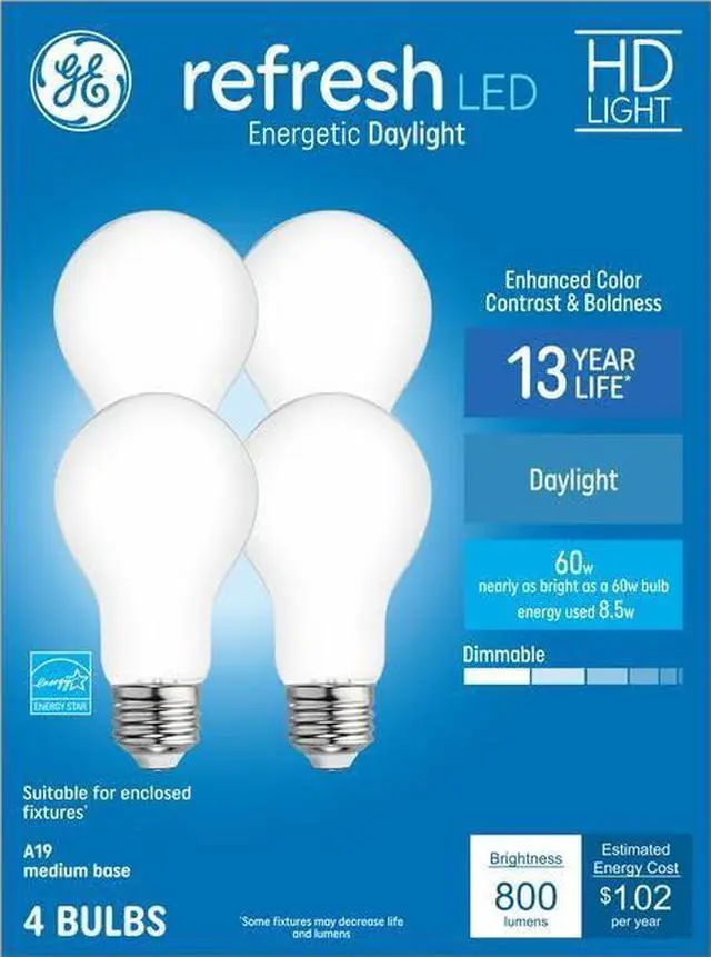 Refresh HD Daylight LED 60-Watt Replacement A19 light bulbs provide enhanced color contrast and boldness versus standard LED bulbs. The high definition daylight light helps create an energetic light thats ideal for active spaces like playrooms, home offices, laundry rooms, basements and garages. Theyre dimmable and illuminate your home with a cool, bluish-white light. These are great for frequently used fixturesthis Refresh HD Daylight LED bulb is rated to last 13.7 years based on 3 hours use per day. Unlike CFL bulbs, GE LED HD bulbs feature enhanced color, instant full brightness and are free of Mercury.