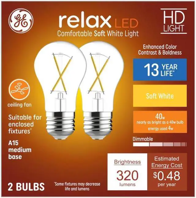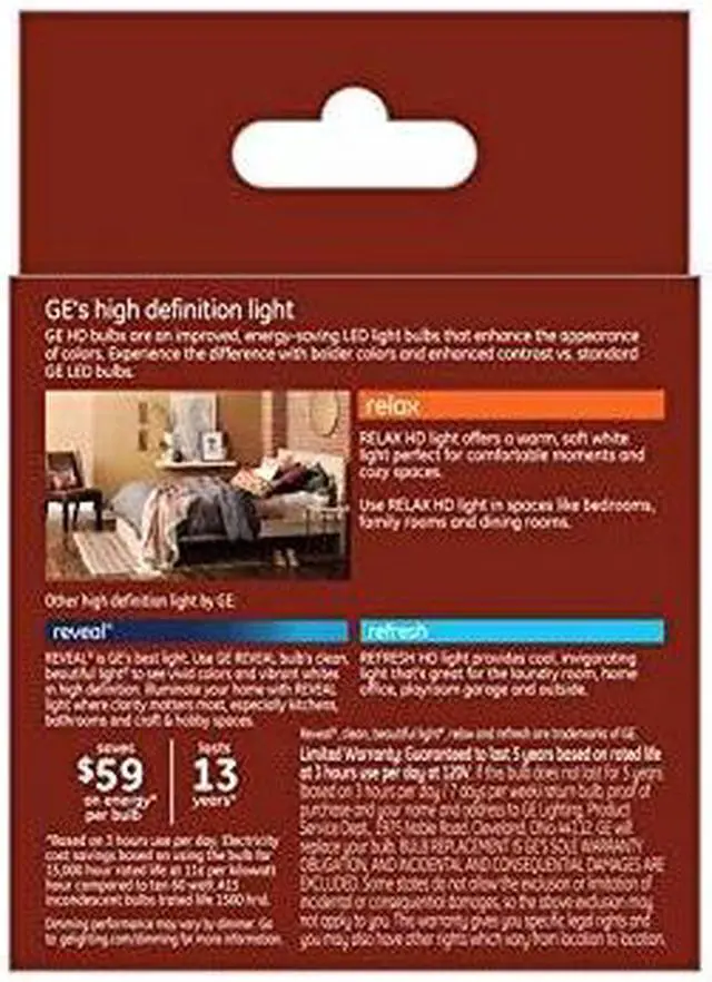 GE High Definition bulbs are an improved, energy-saving LED that enhance the appearance of colors. Experience the difference with bolder colors and enhanced contrast vs. standard GE LED bulbs. Relax HD light offers a warm, soft white light perfect for comfortable moments and cozy spaces. Use relax HD light in spaces like bedrooms, family rooms and dining rooms.