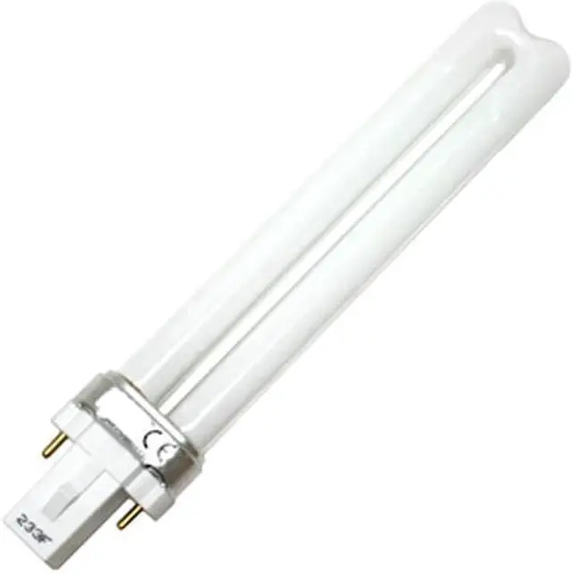 This fluorescent bulb uses 9 watts. It has a single tube 2-pin shape, a maximum overall length of 6.61 inches and a lumens of 600. It has a diameter of 0.50 inches, a color temperature of 2700k and a color rendering index of 82. This bulb has a base of G23, an abbreviation name of CF9S/827 and is manufactured by Ushio.
