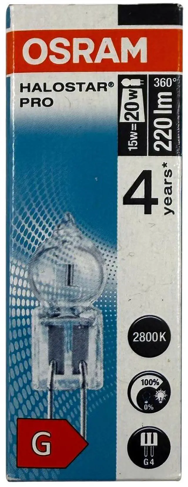 OSRAM 64423 PRO G4 12V 15W = 20W Equivalent - 220 Lumens - Halostar PRO Halogen Lamp