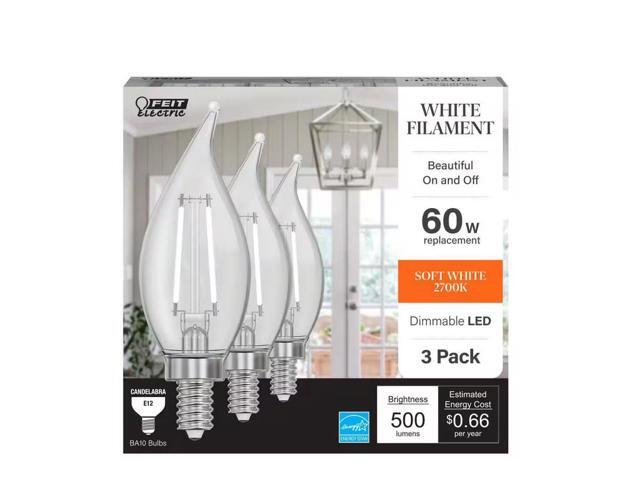 Upgrade your lighting to Feit Electric's elegant Exposed White Filament Flame Tip BA10 LED Bulbs for a fresh take on decorative bulbs. These first-of-their-kind white filament bulbs take a traditional bulb encased in clear glass and add lower-profile white filaments. Unlike yellow filaments, these blend into your current decor, for a timeless look that complements any room. Their dimmable 2700K Soft White glow is ideal for creating a relaxing and comfortable atmosphere with no harsh glare. Use these bulbs in any fixture with a Candelabra E12 base socket such as chandeliers, wall sconces, coach lanterns, and more.