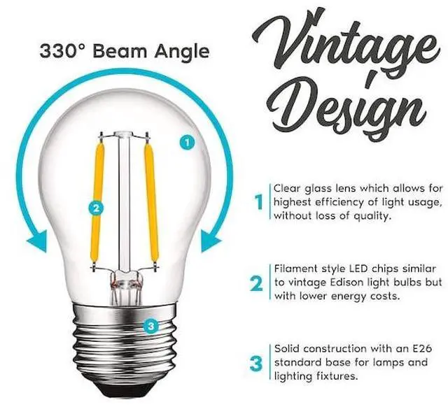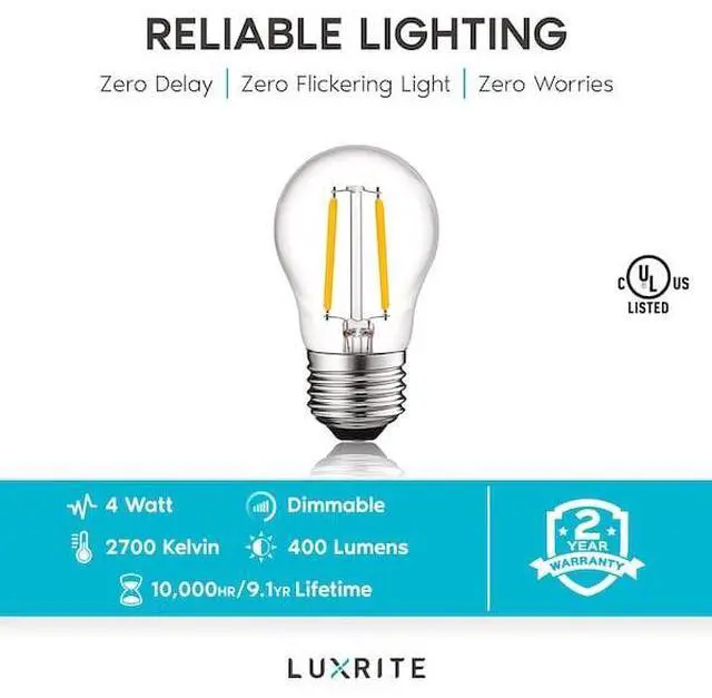 Luxrite Vintage LED A15 Light Bulbs Get the traditional appeal of old fashioned edison light bulbs without the high electricity usage Each LED filament bulb has a clear glass lens to allow for the highest efficiency of light usage, without loss of quality The exposed filament LED chips is not only save you energy but are eye catching in any space A solid construction with E26 medium base make these the ideal choice for decorative lighting fixtures such as chandeliers, ceiling fans, sconces, vanity, and more Capable with lighting dimmers so you can control the amount of light you want in your home or office so you will always have the right amount of light for any situation With an astounding 10, 000 hour lifetime, each candle bulb lasts 5 times longer than the traditional incandescent edison light bulb Feel secure knowing you won't have to replace these lights for the next 9 years Get continuous light with no interruptions and enjoy the classic edison style with LED technology Zero flickering, zero delay, zero worries