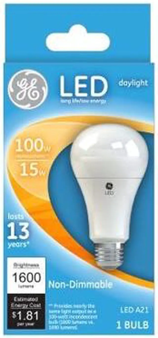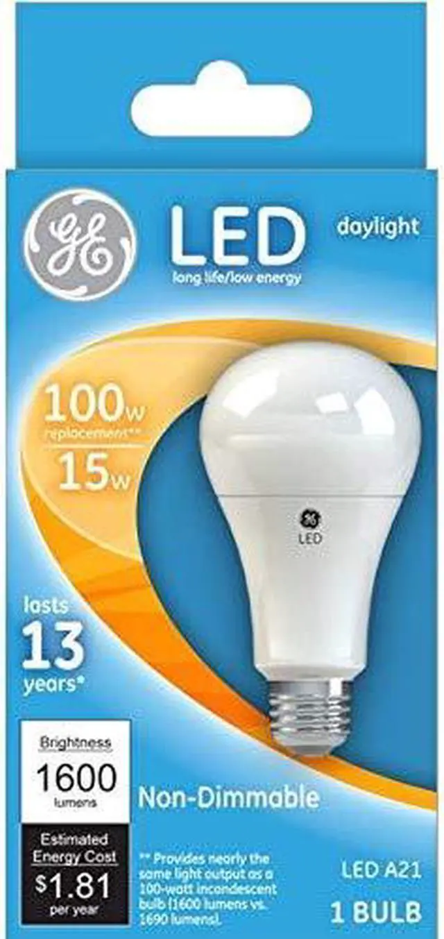 GE LED15A21/5K/BX, 15 Watts, Equivalent To A 100 Watt Incandescent, Dimmable, Lumens: 1600, Color Temperature: 5000, MOL: 5.28”, Rated Life: 15, Boxed, Energy Star Compliant: Y.