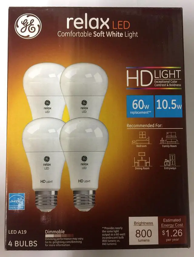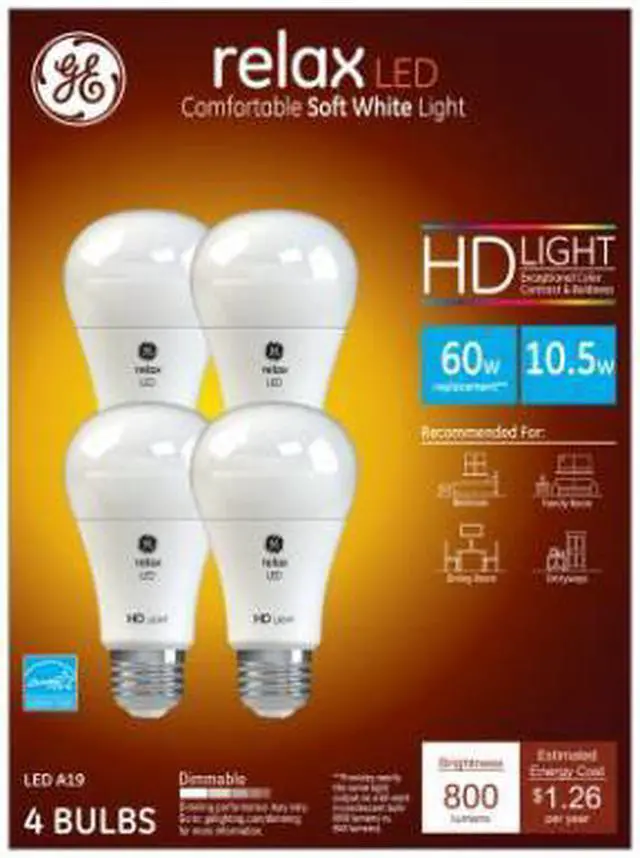GE Relax LED 10 watt (60W) Soft White 800 lumens Dimmable HD A19 96687 4-pack