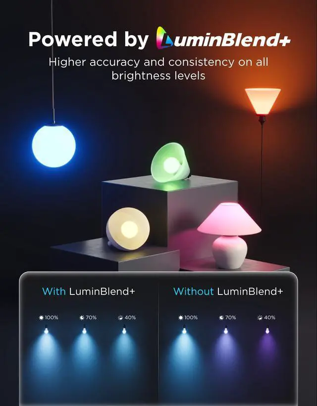Premium Color Accuracy: Powered by LuminBlend+, these Govee Smart Light Bulbs deliver superior color consistency across all brightness levels. Experience true-to-life colors with every adjustment, from subtle ambiance to brilliant illumination.