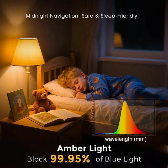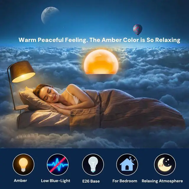 Enhance Sleep QualityBlue-light free, 1800K warm light, the LOHAS sleep aid amber light bulbs will make you and your family feel warm and inviting. Soothing your mood and help you to be more relaxed and sleep peacefully at night. Amber light provides enough light to be clearly visible and not too bright to interfere with sleep patterns.