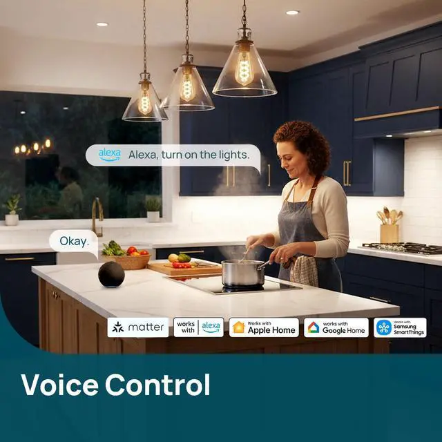 NOTEBefore you buy, please confirm fit: this is a ST19/ST58 E26 smart light bulb sized 2.28 in / 58 mm (diameter) × 5.04 in / 128 mm (height), ideal for pendant lights, table lamps, floor lamps, and open vintage-style fixtures where the bulb is visible. It supports 2.4GHz Wi-Fi only (not 5GHz). This bulb is not compatible with wall dimmer switches (may cause flickering/buzzing), so adjust brightness via the AiDot/Matter app or voice control and use a standard on/off switch