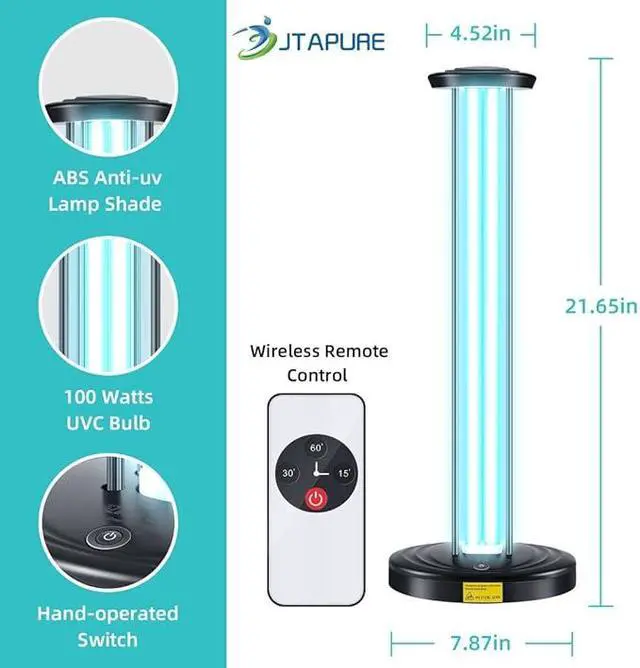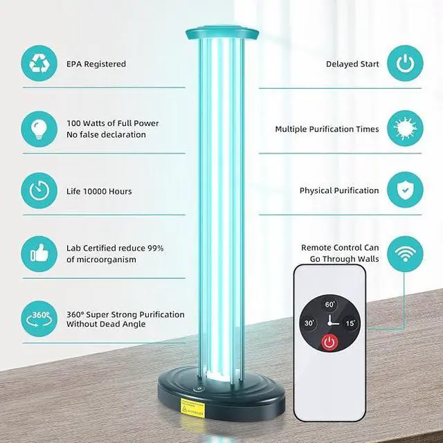 Powerful Technology Our Home Purification Device features a 100W high-power UVC lamp with a 99.9% efficiency rate, effectively destroying the DNA of allergens and substances with potential health risks. This ensures a safer environment by preventing microorganisms from reproducing and spreading.