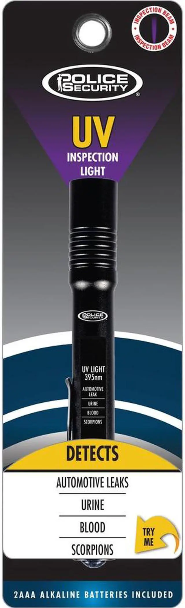 Police Security Ultraviolet Inspection Light - AAA - Aluminum - Black Ultraviolet inspection light features UV LEDs that can reveal materials that are not seen through normal lighting such as automotive leaks, pet urine and blood. Lightweight aluminum construction and handy belt clip allow easy portability. Light is powered by the two included AAA batteries and provides up to 6 hours of use. Inspection light with a 395nm output is perfect for mechanics, hunters, industrial tradesmen and more.