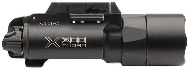 Designed to meet the needs of hard-use professionals, the SureFire X300T-A Turbo LED Weaponlight in black delivers 650 lumens of intense, tightly focused, far-reaching white light with a hot spot that is tremendously effective. You can count on the X300T-A to help you positively identify threats at extreme distances while providing ample spill light to help you maintain situational awareness. Ambidextrous switching provides one-finger control of momentary-on or constant-on activation. Its rugged, aerospace aluminum body is Mil-Spec hard anodized for scratch and corrosion resistance and sealed to make it weatherproof. It's also IPX7 waterproof to 3.3 ' for 30 minutes.